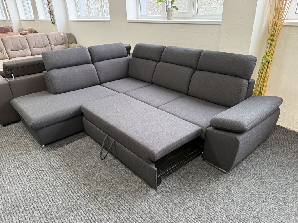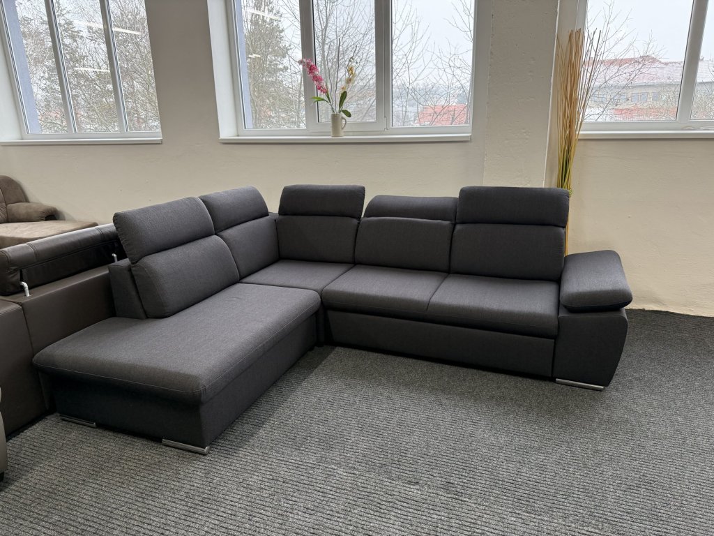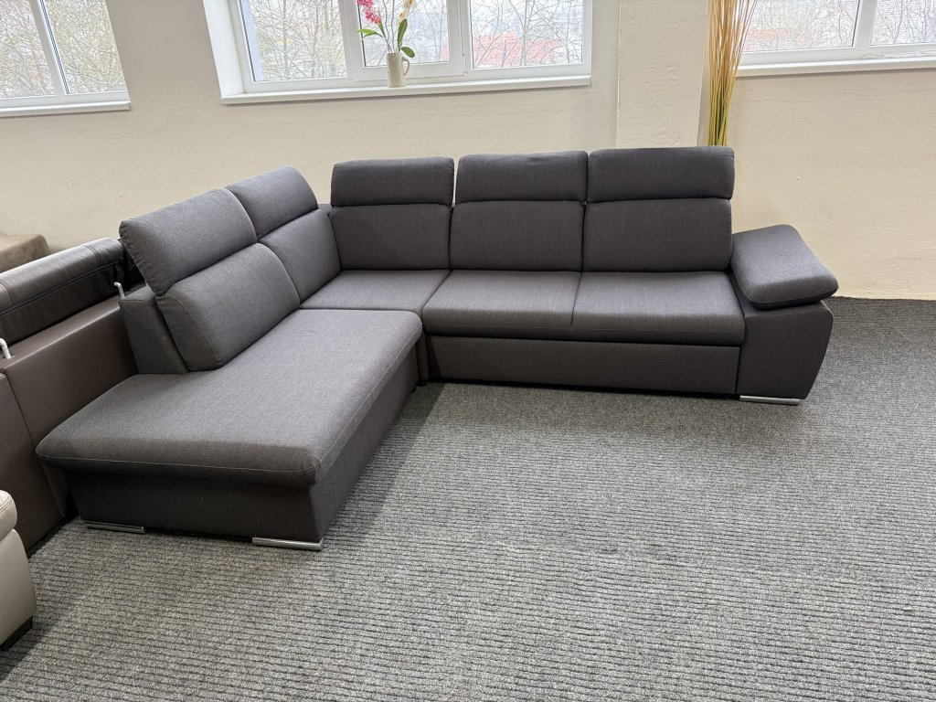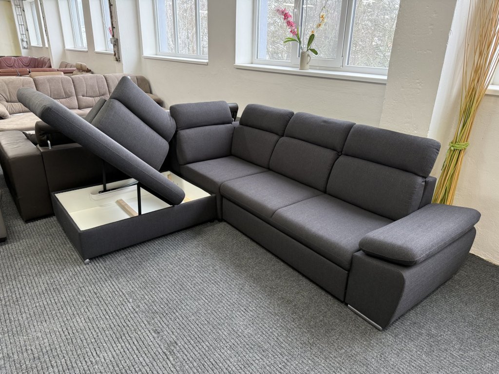 Rohová sedací souprava v látkovém provedení, celočalouněná, ve stavu nepoužitá. Souprava je vybavena rozkládacím mechanismem pro příležitostné spaní, úložným prostorem a polohovacími opěrkami hlavy. Vhodná pro každodenní sezení i občasné přespání.