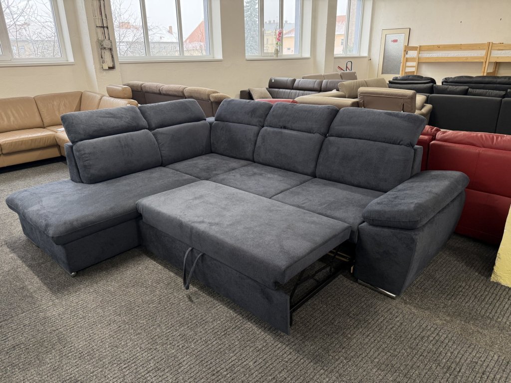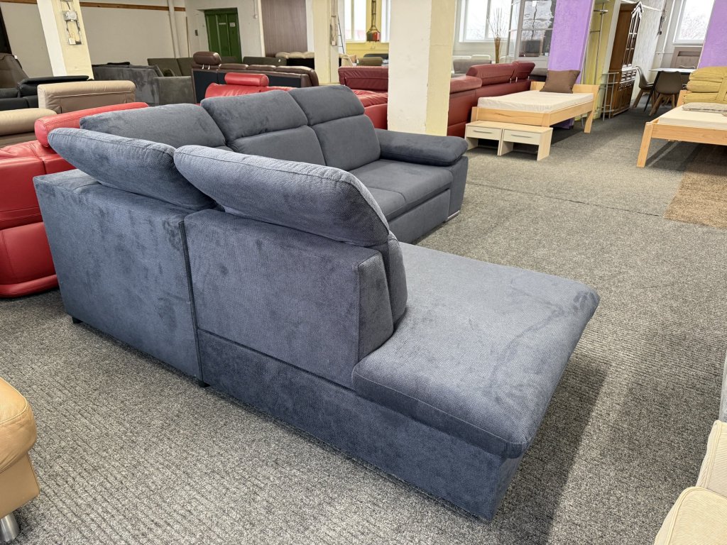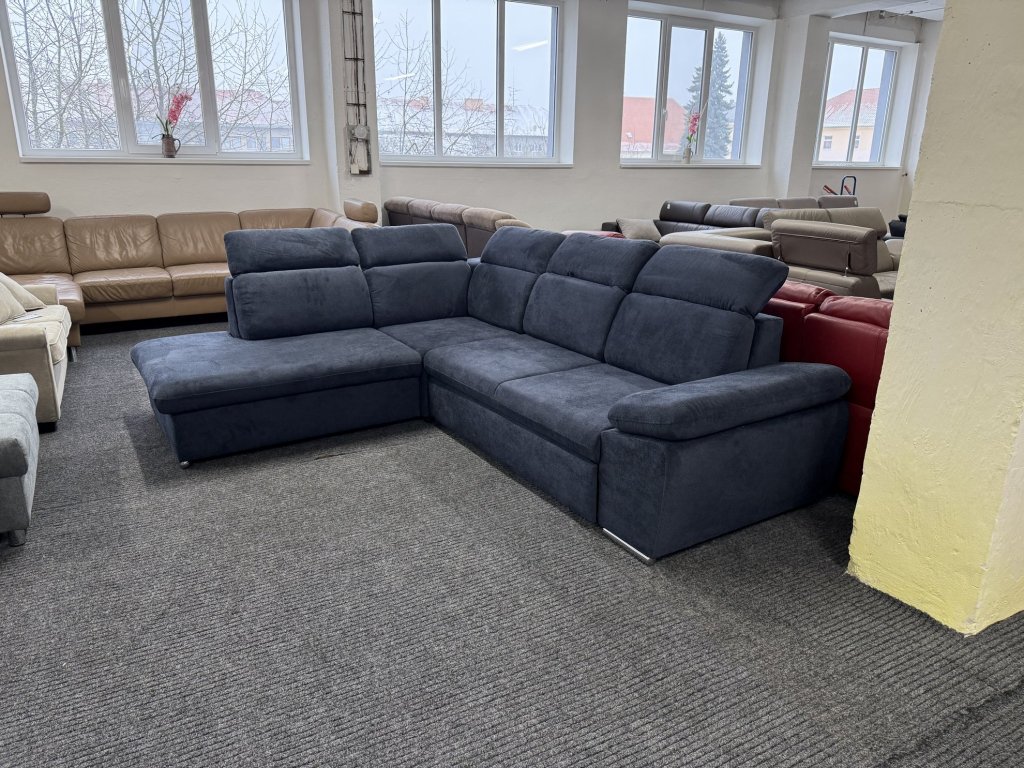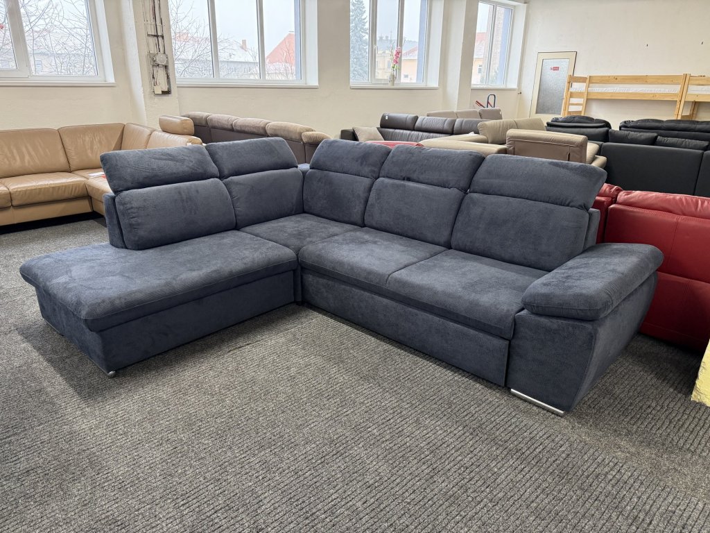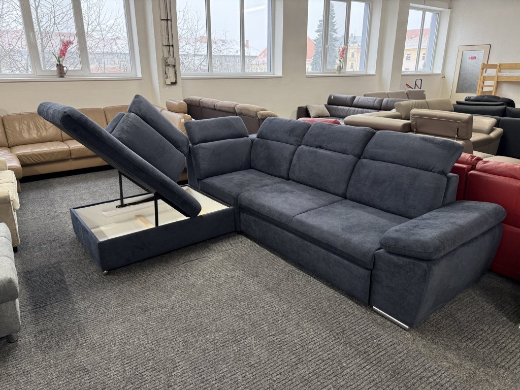 Rohová sedací souprava v látkovém provedení, celočalouněná, ve stavu nepoužitá. Souprava je vybavena rozkládací funkcí, úložným prostorem a polohovacími opěrkami hlavy. Provedení umožňuje umístění do různých typů interiérů.
