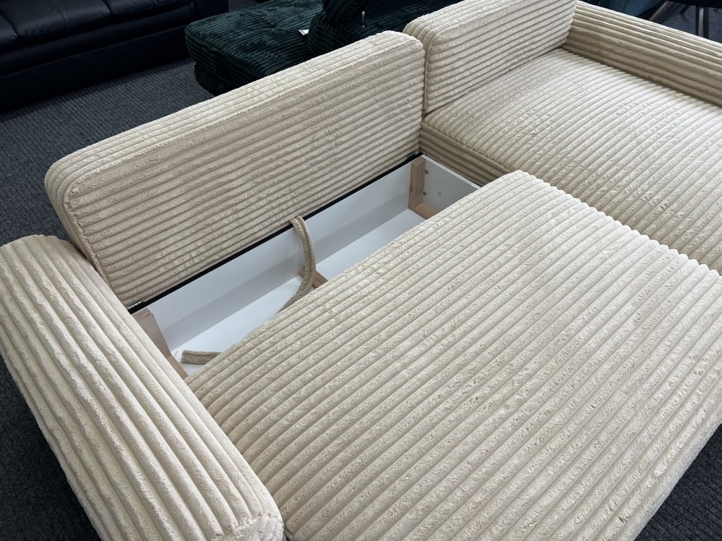 Sedací souprava je vhodná pro každodenní sezení i příležitostné spaní, s možností uložení lůžkovin do integrovaného úložného prostoru.