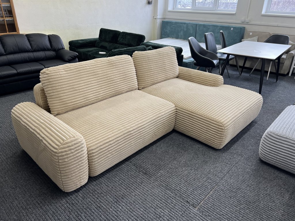 Rohová sedací souprava v látkovém provedení s rozkládací funkcí a integrovaným úložným prostorem. Sedačka je celočalouněná, vhodná pro umístění do prostoru. Stav nepoužitá. Konstrukce je řešena jako rohová sestava s možností rozložení na lůžko.