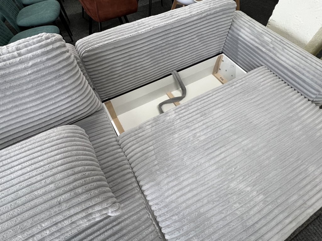 Rohová sedací souprava v látkovém provedení s rozkládací funkcí a úložným prostorem. Sedačka je celočalouněná, vhodná pro umístění do prostoru. Stav nepoužitá. Konstrukce je řešena jako rohová sestava s možností rozložení na lůžko.