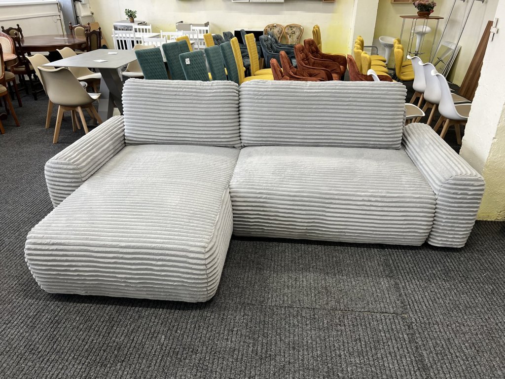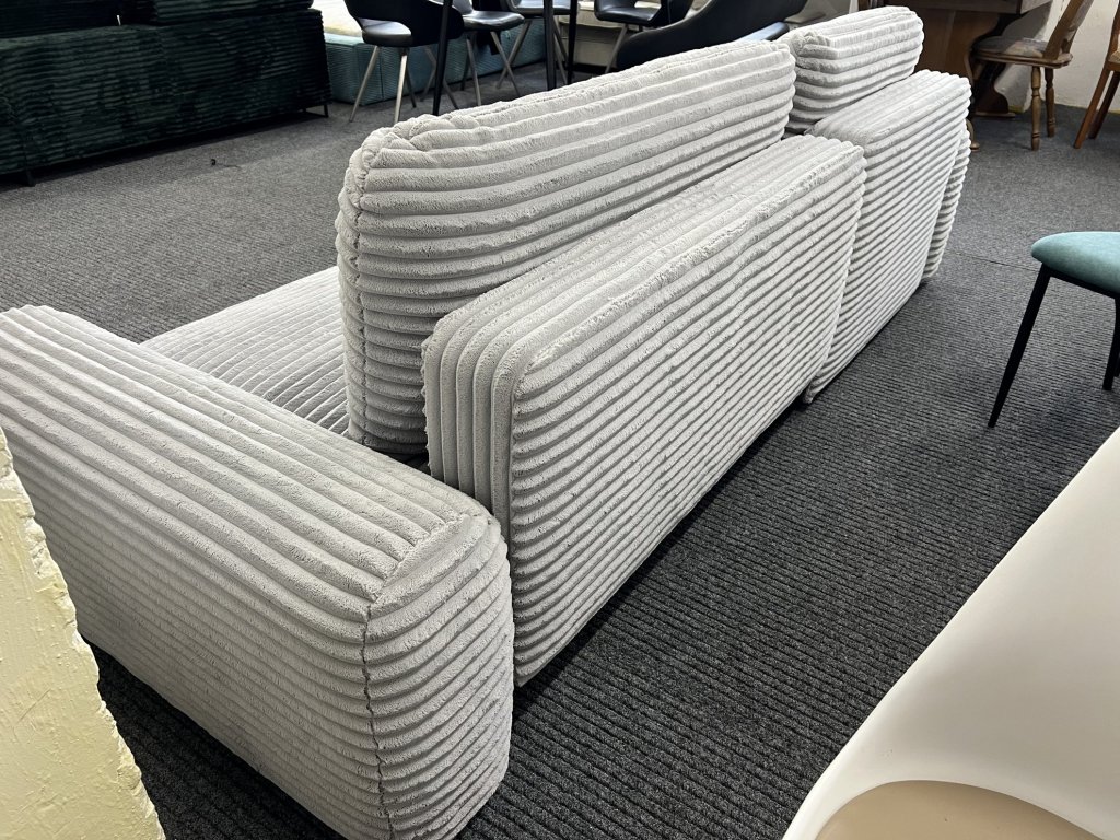 Sedací souprava je potažena látkou s výraznou žebrovanou strukturou. Provedení je rohové, s masivními sedáky, opěrkami a područkami. Zadní část je celočalouněná.