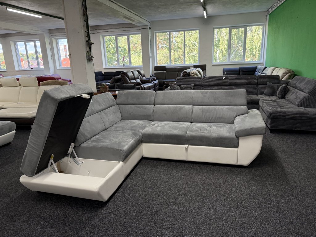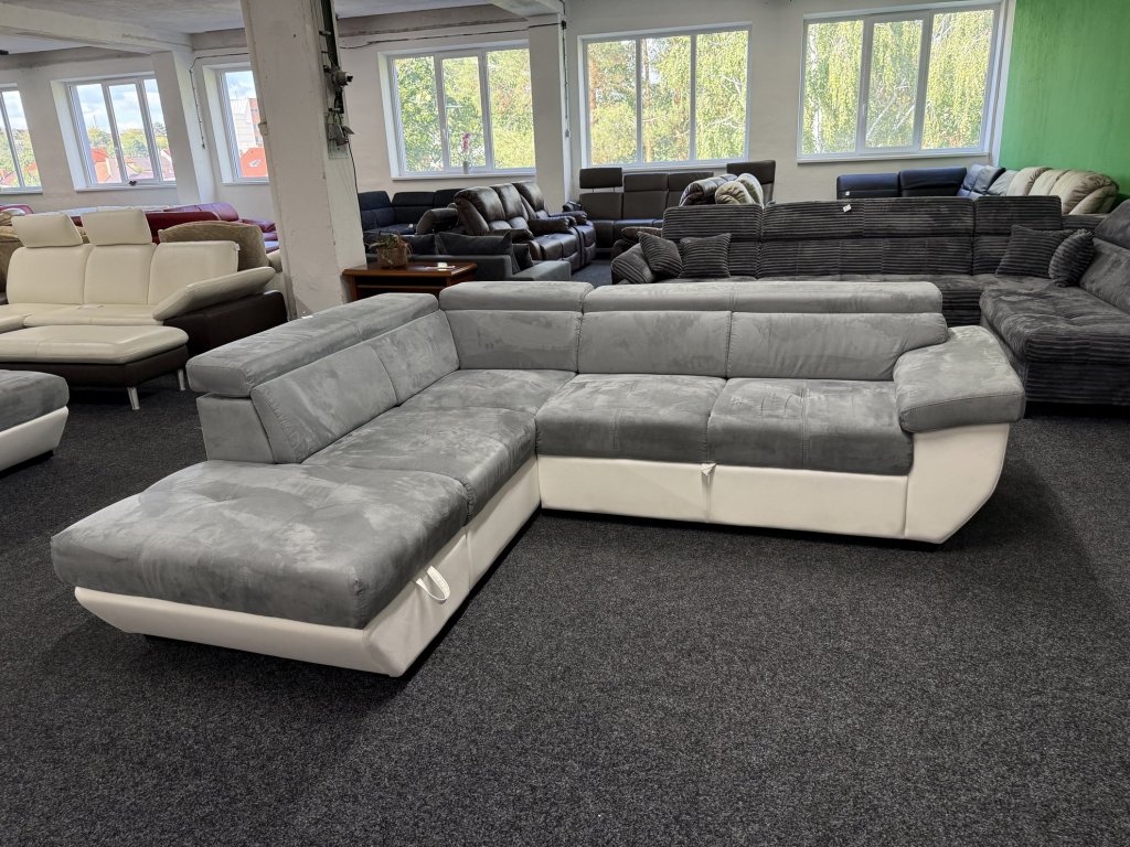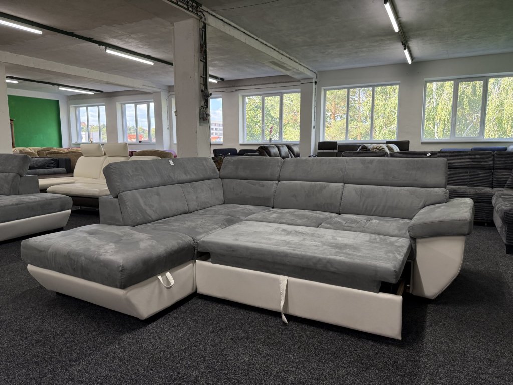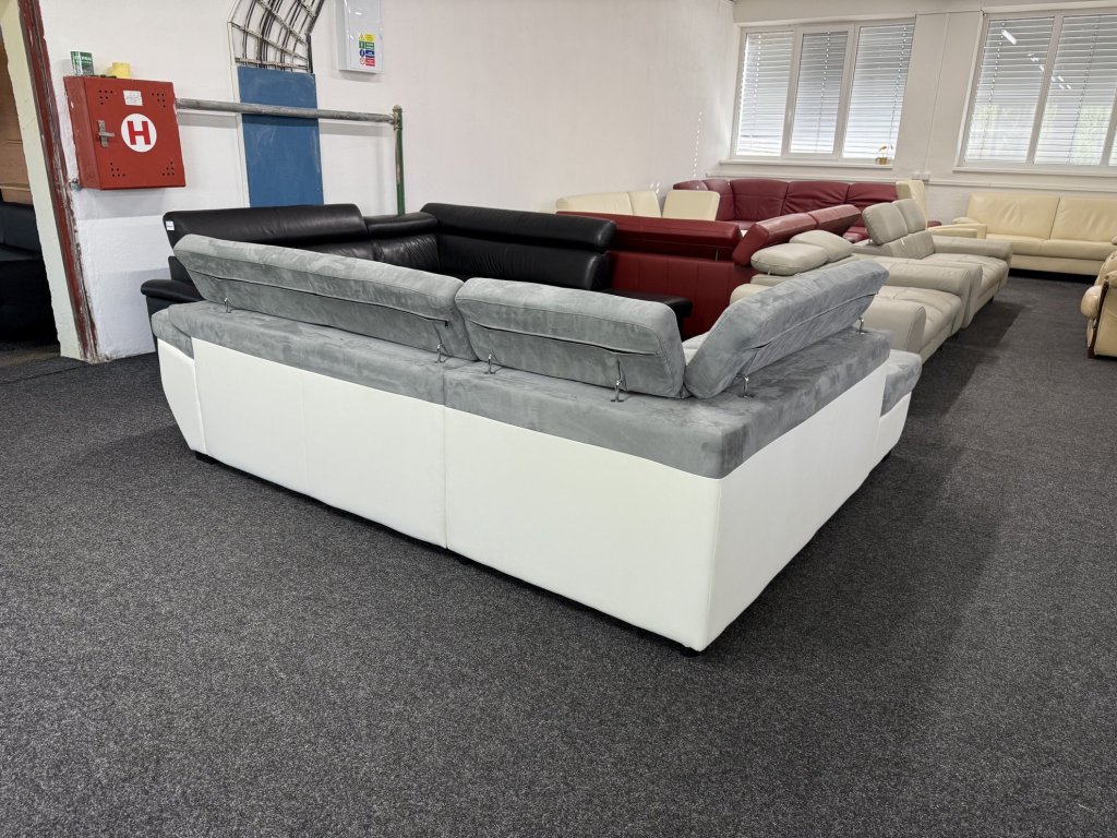 Sedací souprava ve tvaru L v kombinaci bílé a šedé barvy je potažena látkou. Nabízí funkci rozkladu pro příležitostné spaní a disponuje menším úložným prostorem. Opěrky hlavy jsou polohovací. Souprava je nepoužitá.