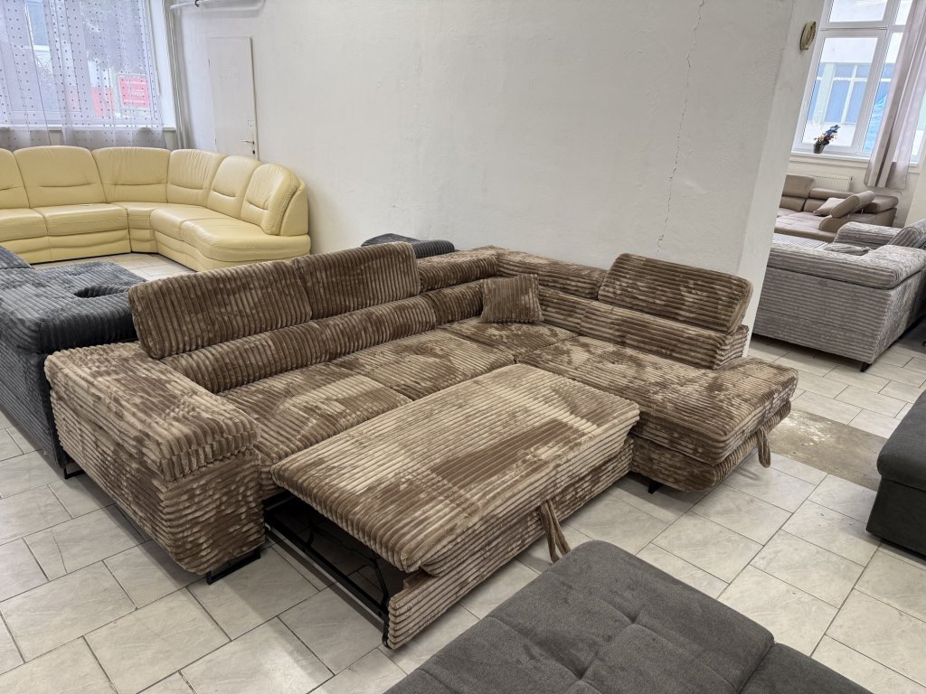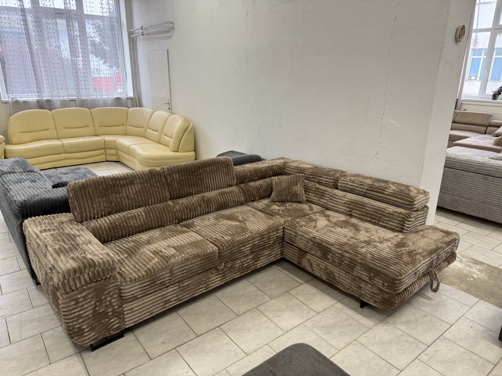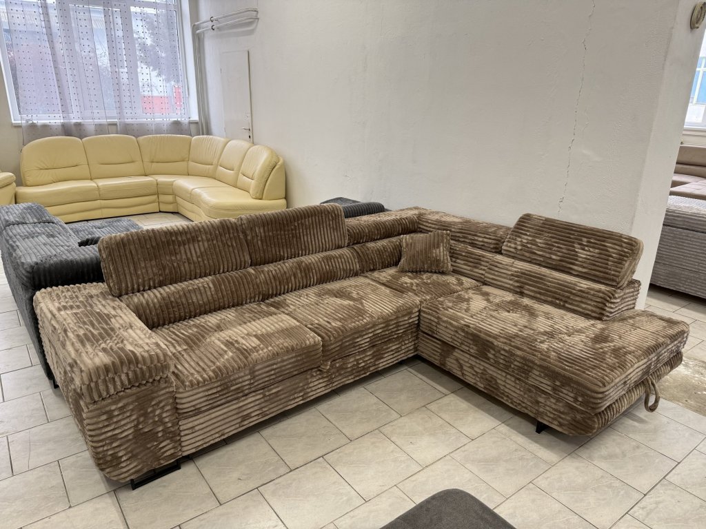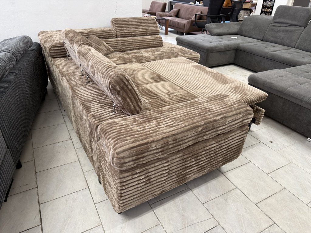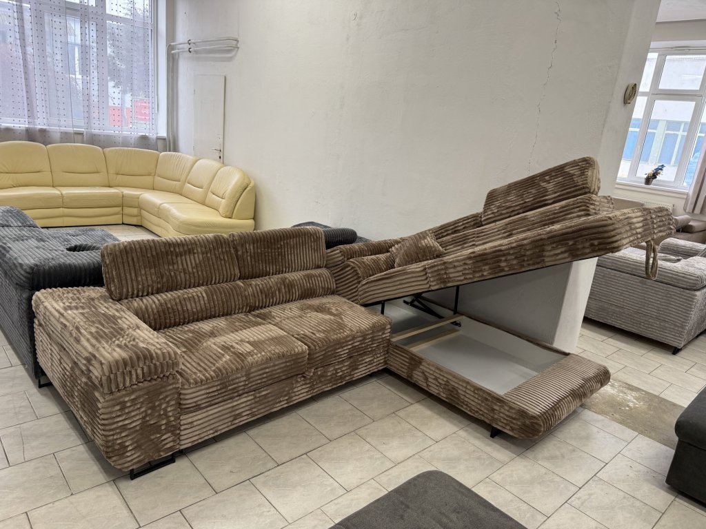 Rohová sedací souprava v látkovém provedení, celočalouněná ze všech stran. Souprava je vybavena rozkládací funkcí pro příležitostné spaní, úložným prostorem a polohovacími opěrkami hlavy. Stav nepoužitá.