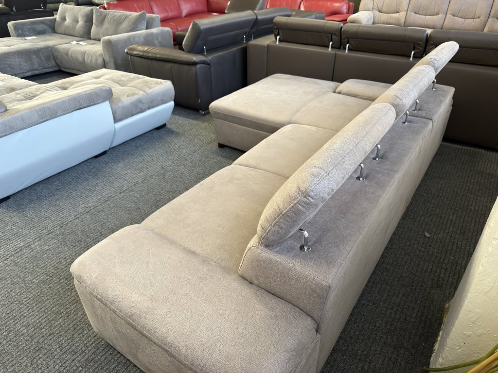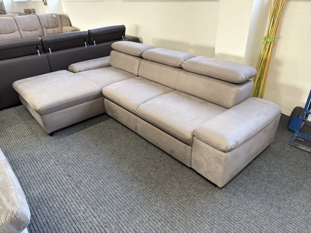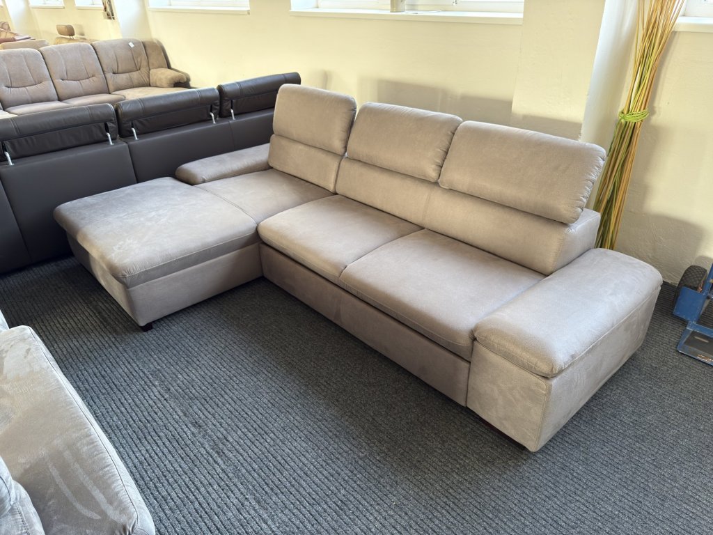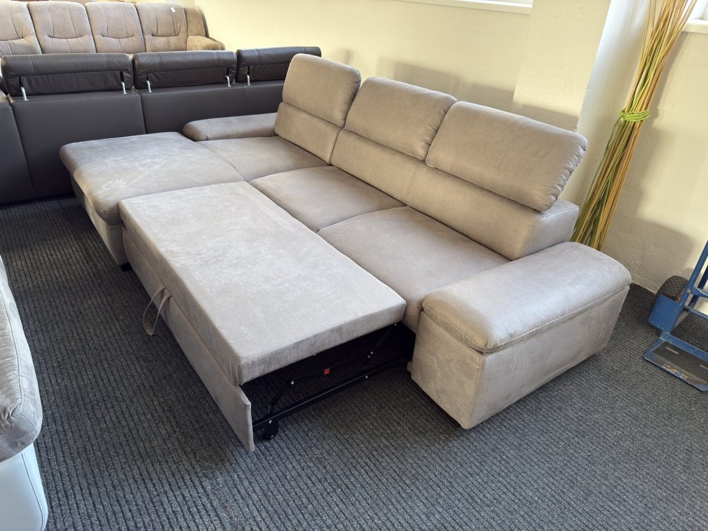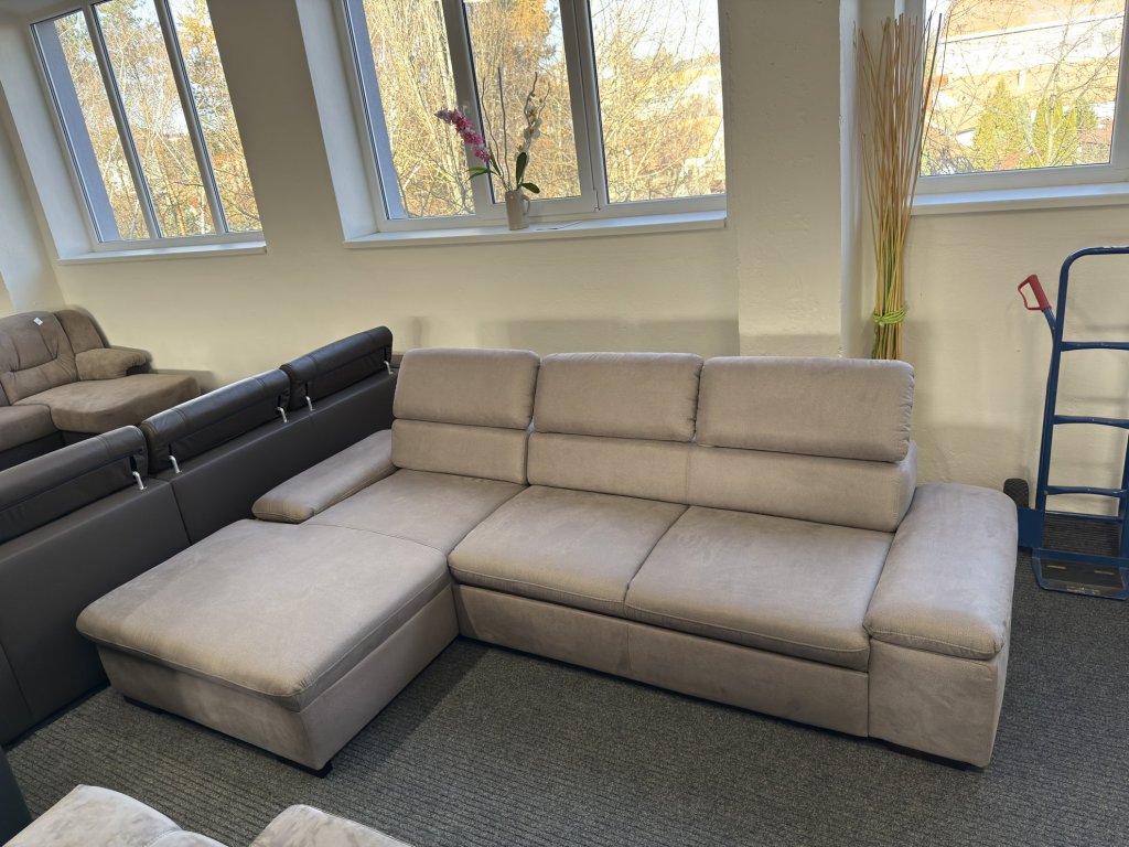 Rohová sedací souprava v látkovém provedení. Konstrukce je celočalouněná, výsuvný díl umožňuje vytvoření plochy pro příležitostné spaní. Opěrky hlavy jsou polohovací. Souprava je nepoužitá.