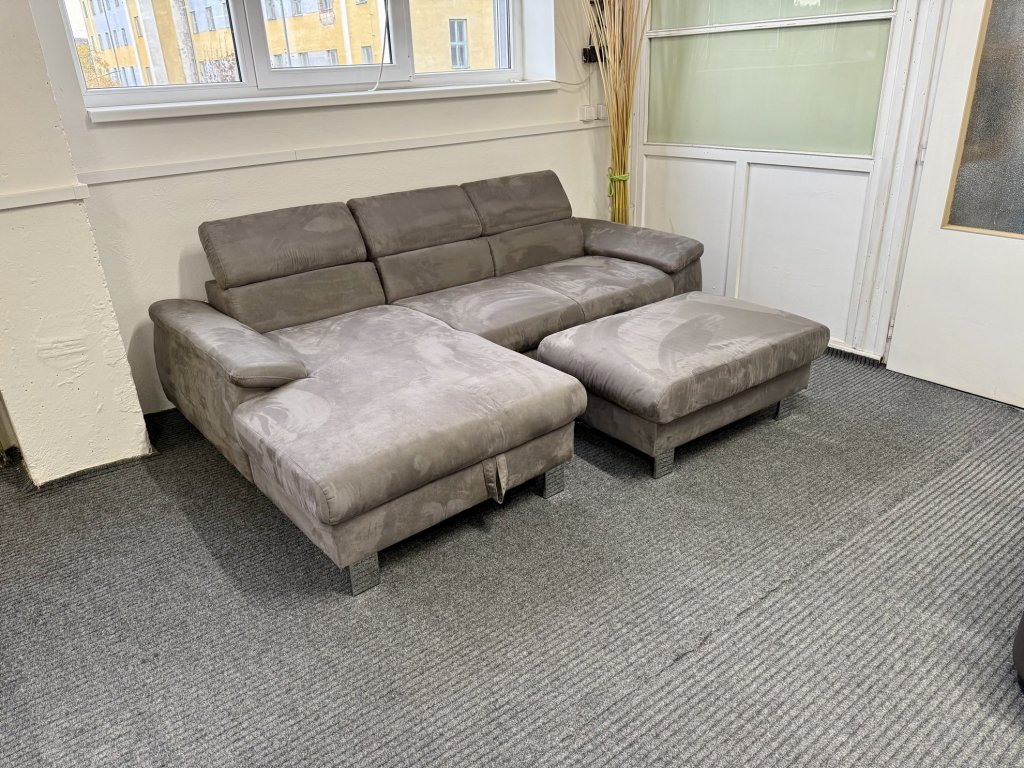 Sedací souprava v šedé barvě s taburetem. Potah je látkový, konstrukce celočalouněná. Sedačka nabízí funkci rozkladu s plochou na spaní a úložný prostor. Součástí jsou polohovací opěrky hlavy.