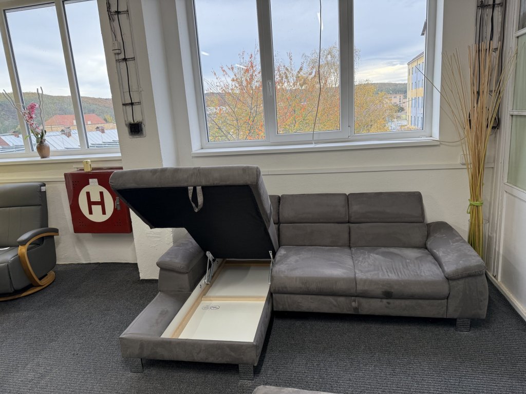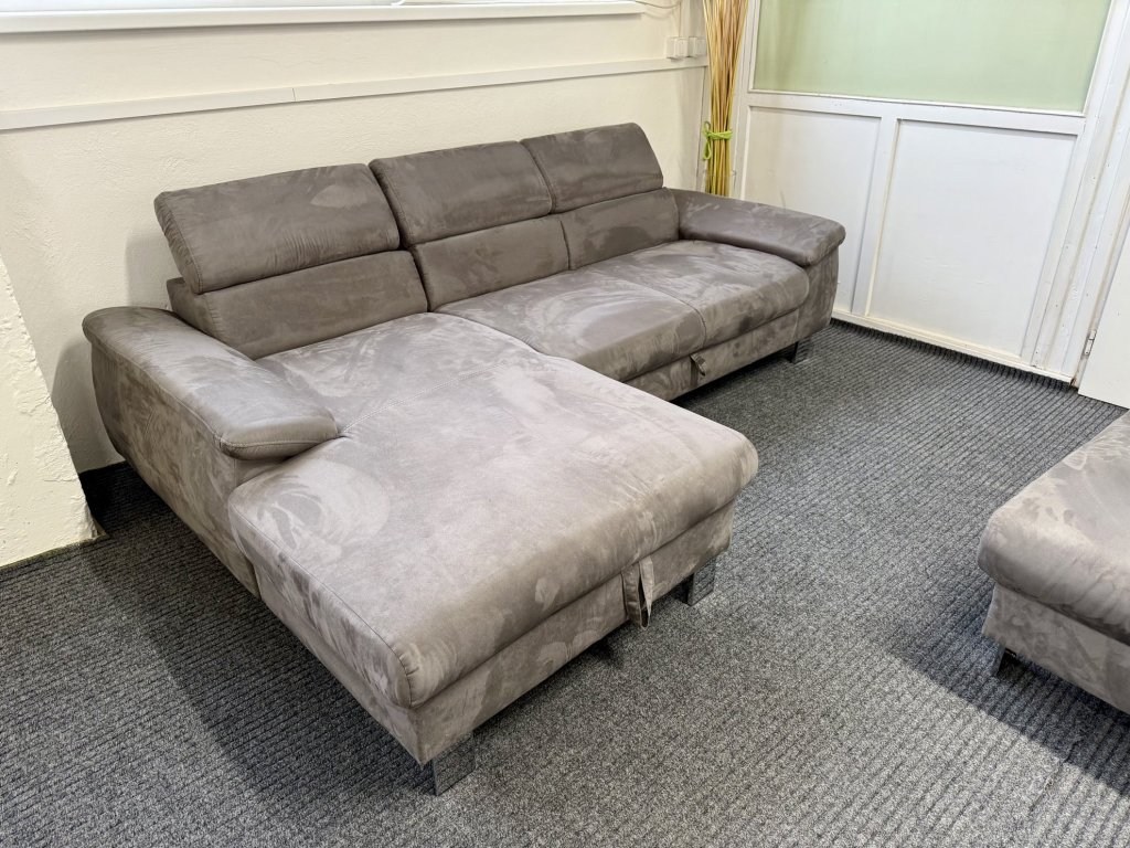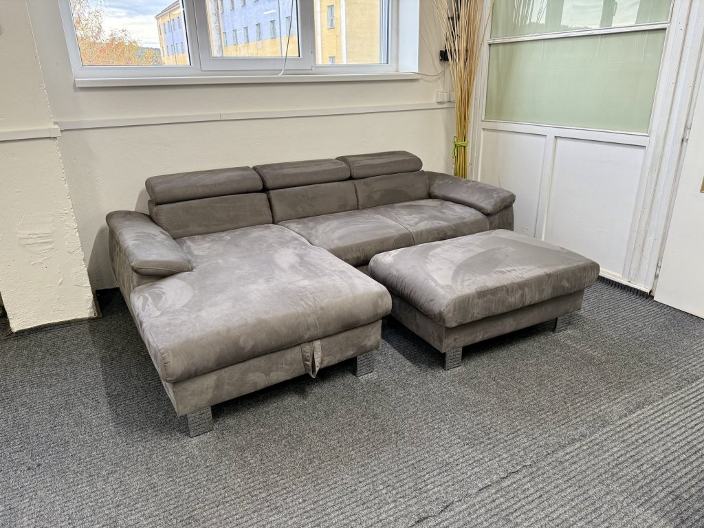 Sedací souprava v šedé barvě s taburetem. Potah je látkový, konstrukce celočalouněná. Sedačka nabízí funkci rozkladu s plochou na spaní a úložný prostor. Součástí jsou polohovací opěrky hlavy.