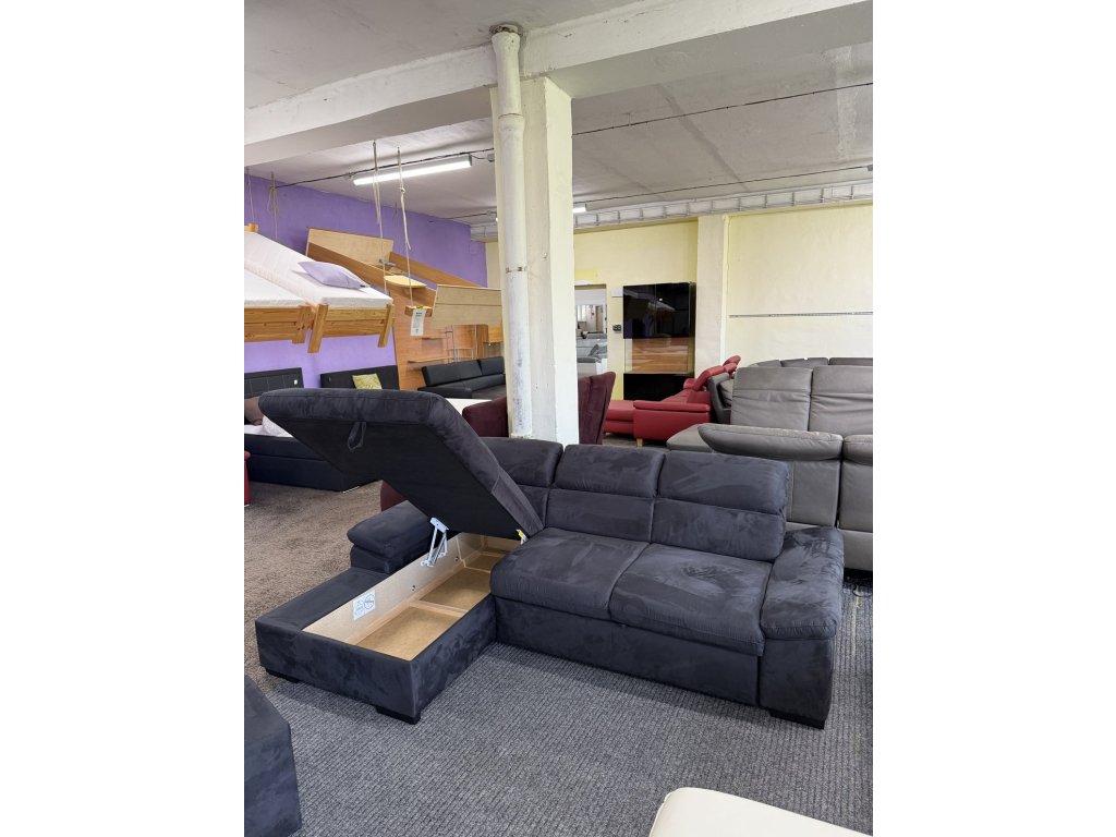 Rohová sedací souprava je celočalouněná, potažená látkou v tmavě šedém odstínu. Součástí je taburet, funkce rozkladu a úložný prostor. Sedačka má polohovací opěrky hlavy a je nepoužitá.