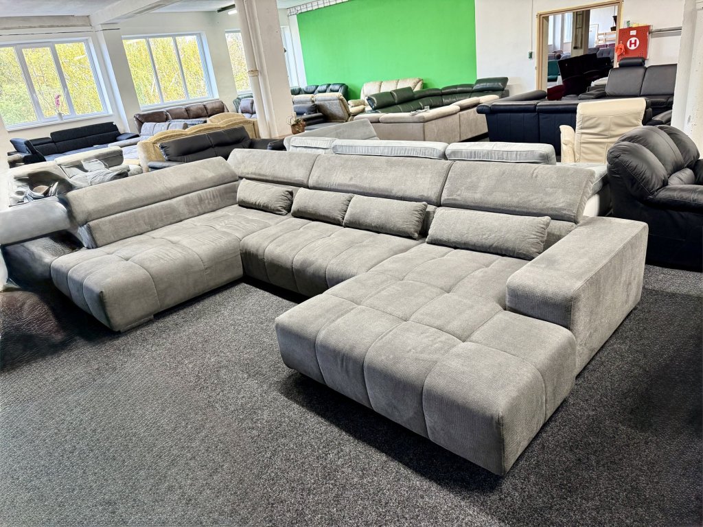 Moderní sedací souprava ve tvaru U v šedém látkovém provedení. Čisté linie, široké sedáky a nízký područník vytvářejí současný vzhled vhodný do prostornějších interiérů. Díky své šířce poskytuje dostatek místa k sezení i odpočinku.