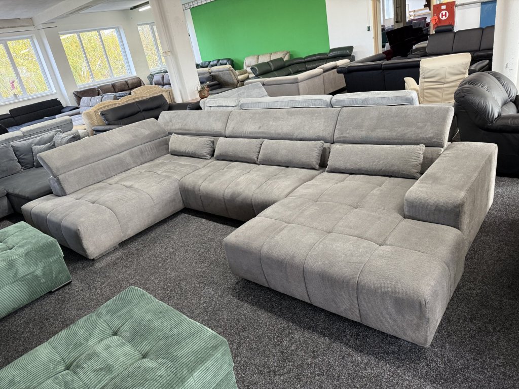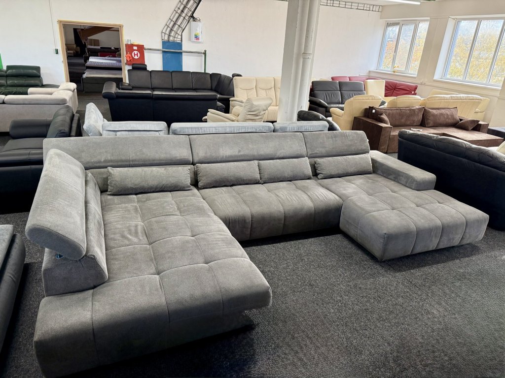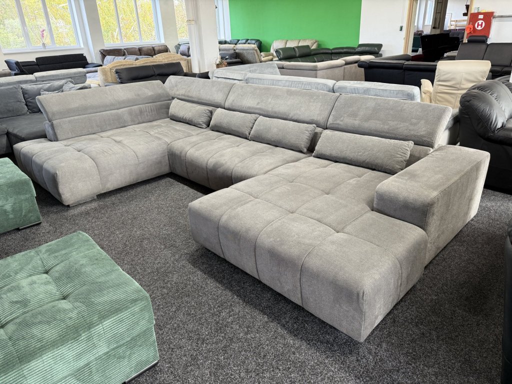 Moderní sedací souprava ve tvaru U v šedém látkovém provedení. Čisté linie, široké sedáky a nízký područník vytvářejí současný vzhled vhodný do prostornějších interiérů. Díky své šířce poskytuje dostatek místa k sezení i odpočinku.