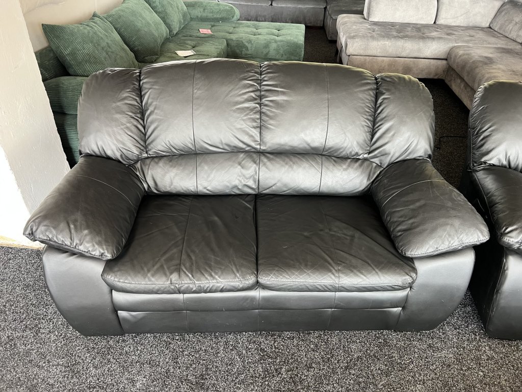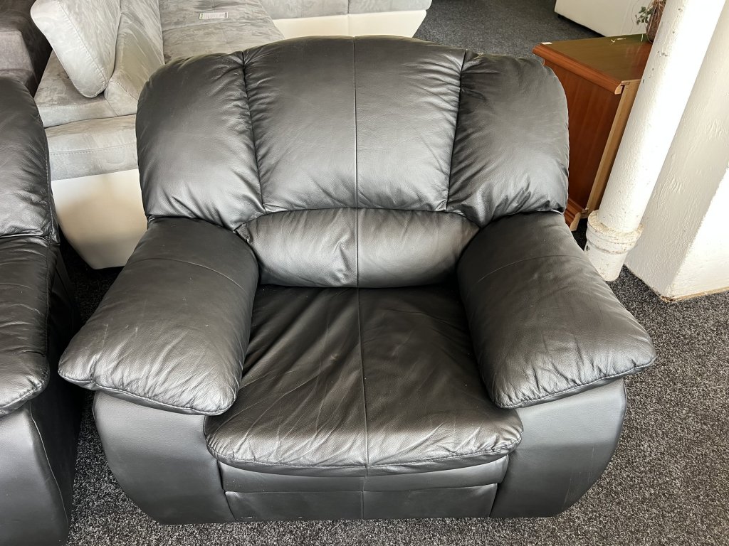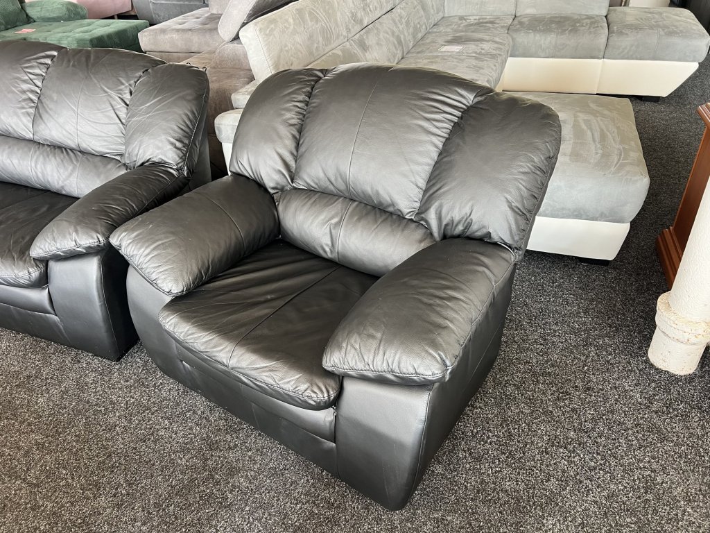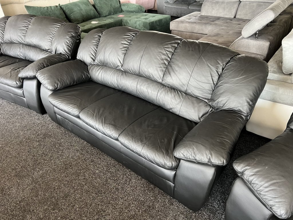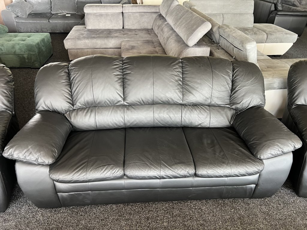 Sestava sedací soupravy tvořená trojsedákem, dvojsedákem a křeslem. Povrch z pravé kůže v černém provedení, čalounění je měkké a tvarované. Sedačka je nepoužitá.