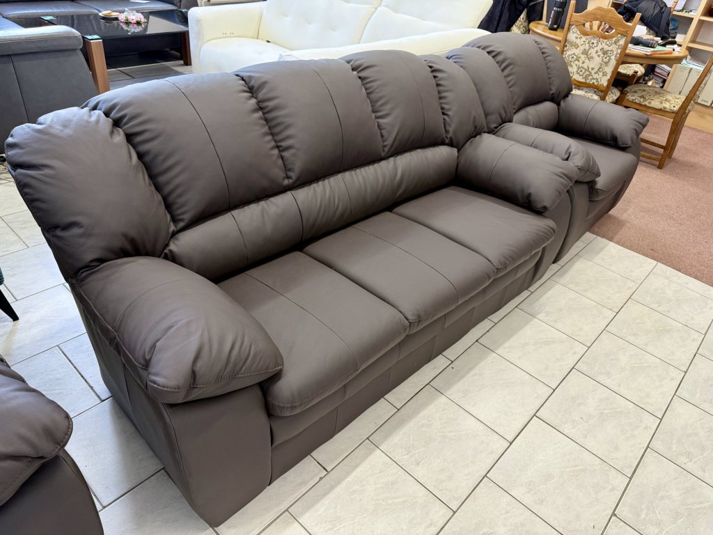 Sedací souprava trojka, dvojka a křeslo, kožená, není celočalouněná, hnědá barva. Nepoužitá.