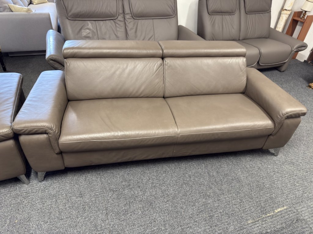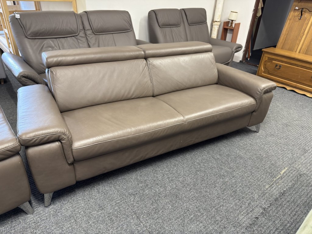 Pohovky mají rovné linie, hnědý kožený potah a kovové nohy. Opěradla jsou řešena v jednom kuse, s horní polstrovanou částí.