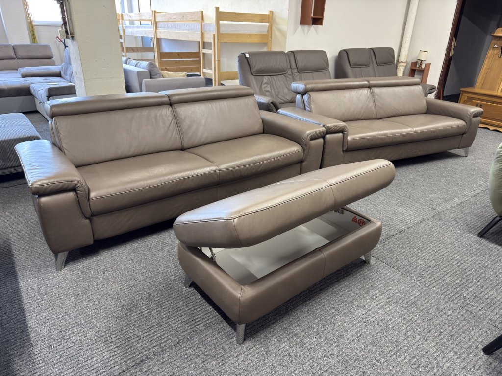 Souprava zahrnuje dvě samostatné trojpohovky. Taburet je výklopný a nabízí vnitřní úložný prostor.