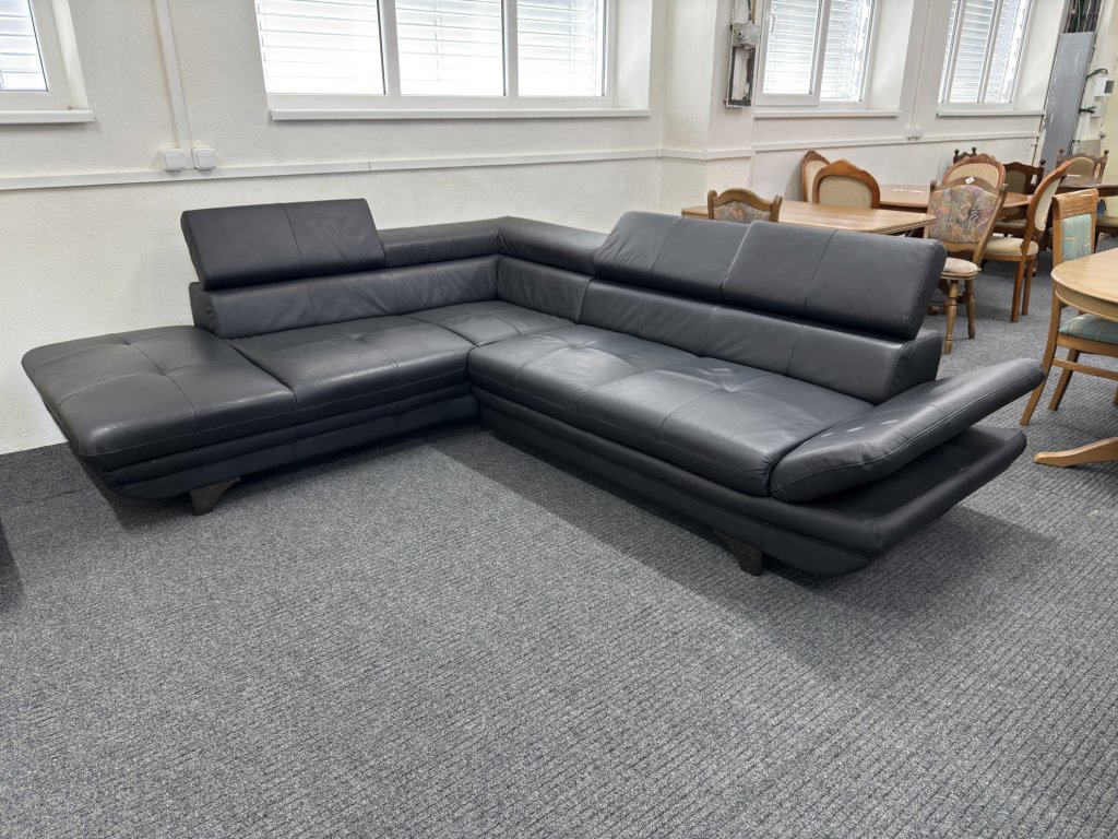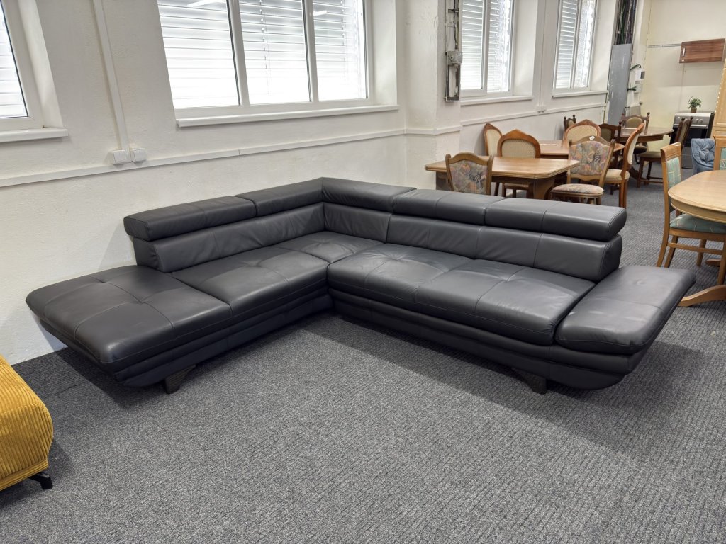 Rohová sedací souprava v koženém provedení. Souprava není celočalouněná. Je vybavena polohovacími opěrkami hlavy a polohovací područkou.
