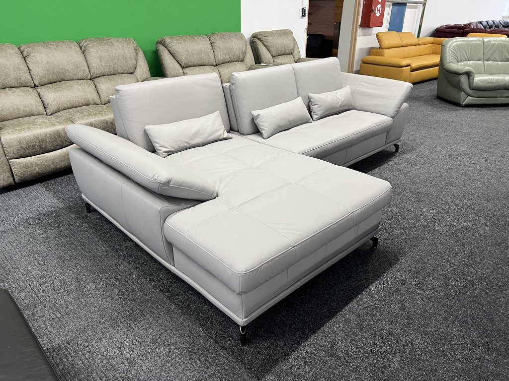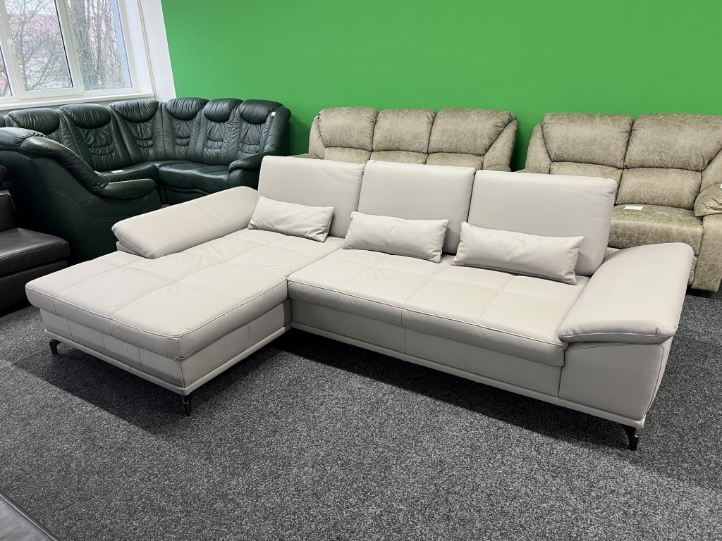 Rohová sedací souprava v koženém provedení s možností nastavení hloubky sedu a polohování područek. Vhodná pro variabilní uspořádání sezení.