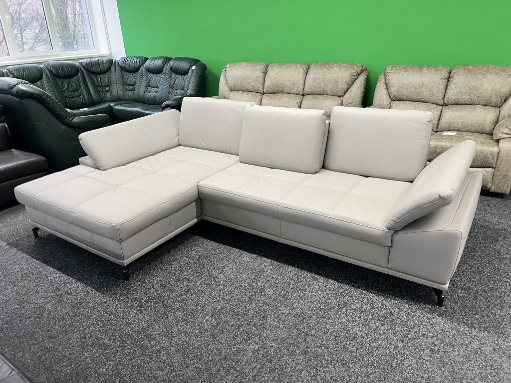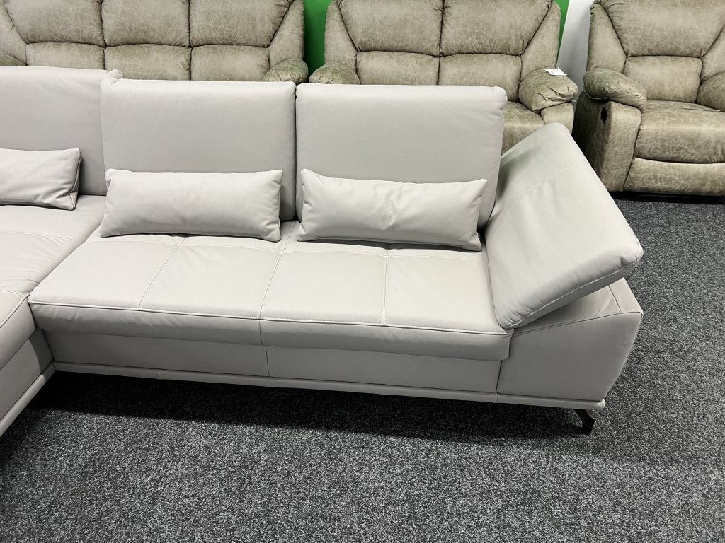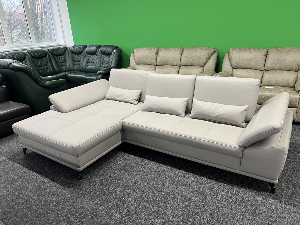Rohová sedací souprava v koženém provedení s posuvnými opěradly a polohovacími područkami. Sedačka je celočalouněná, vhodná pro umístění do prostoru. Stav nepoužitá.