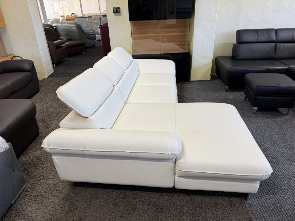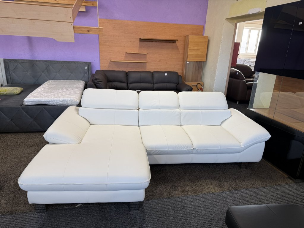 Rohová sedací souprava v koženém provedení, celočalouněná, vybavená polohovacími opěrkami hlavy. Sedací souprava je nepoužitá a je určena pro každodenní sezení v obývacím prostoru.