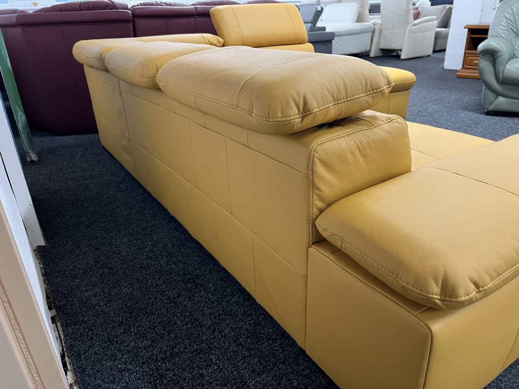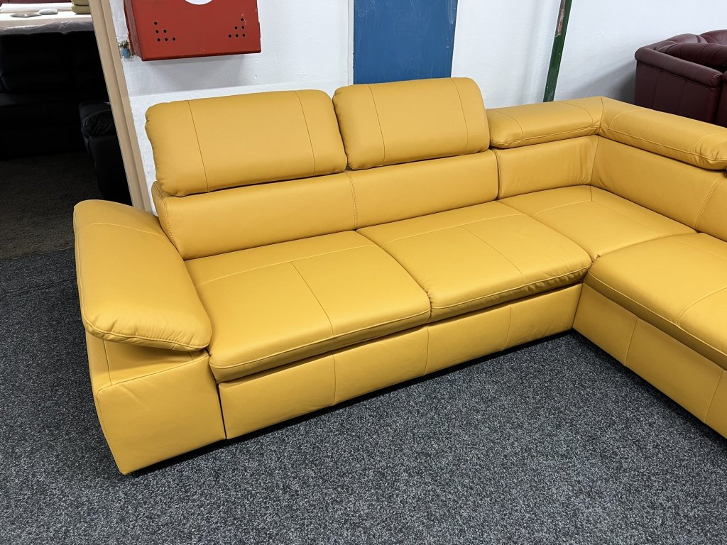 Sedací souprava je provedena ve žlutém koženém čalounění. Tvar rohu umožňuje umístění do prostoru i ke stěně díky celočalouněnému provedení. Sedáky a opěrné části jsou členěny pravidelným prošitím.