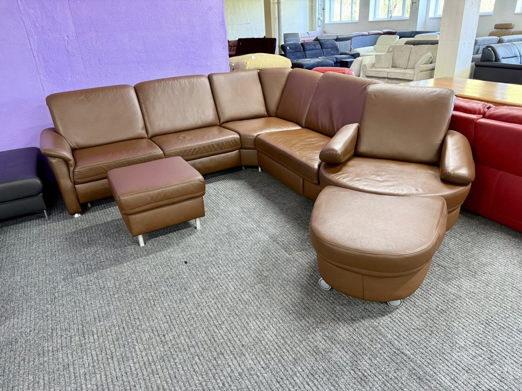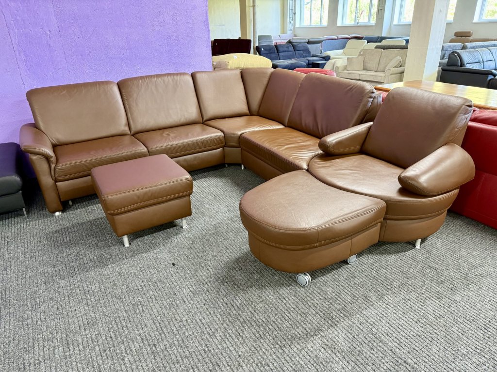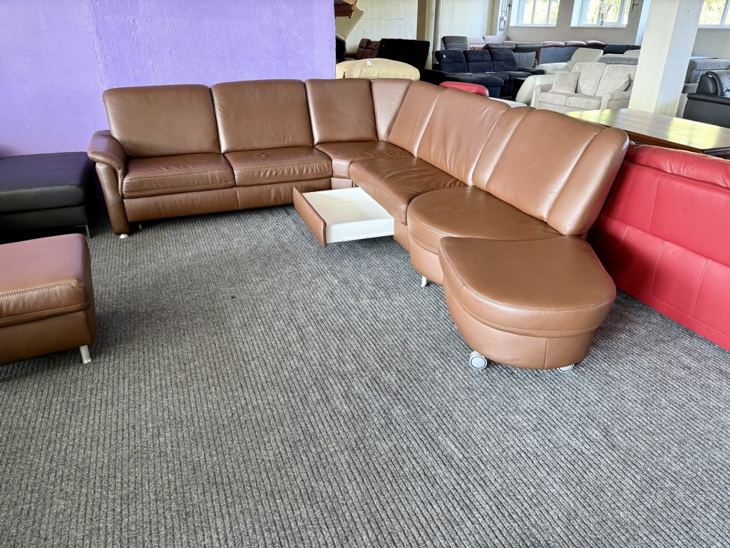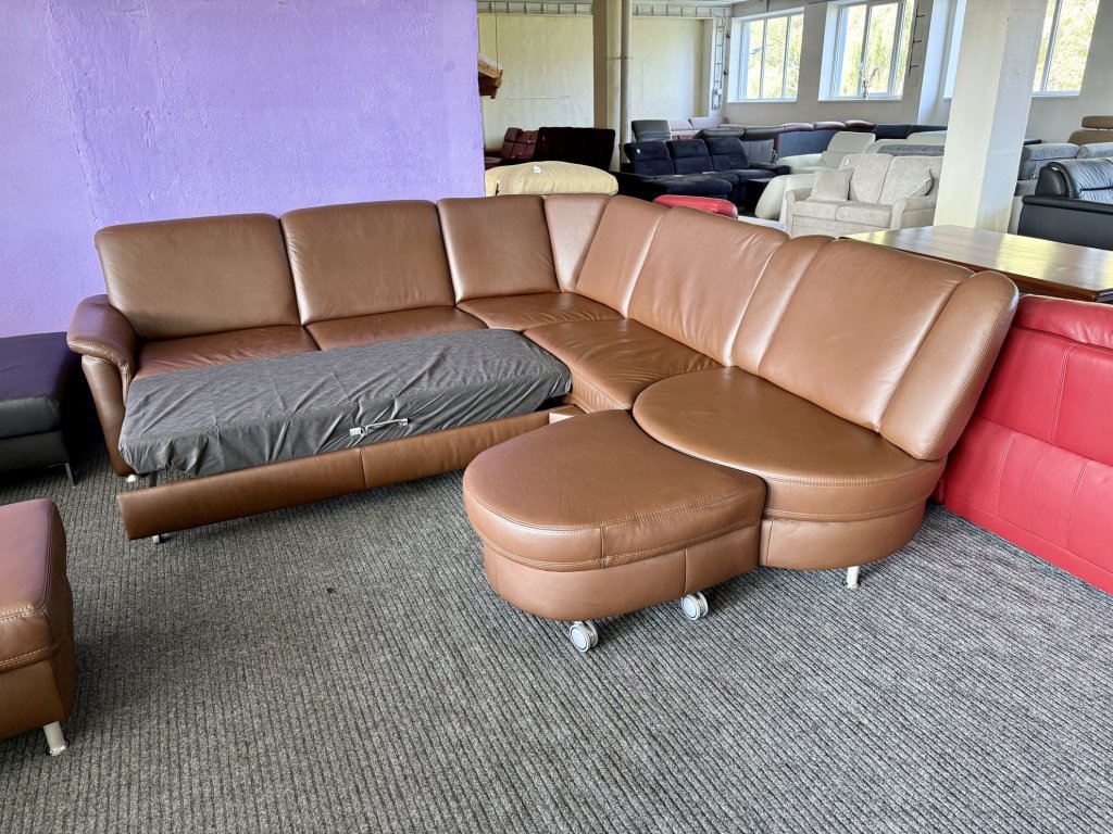 Zánovní celočalouněná rohová sedací souprava z pravé kůže v hnědé barvě. Součástí jsou dva taburety a otočné zakončení sedací části. Sedačka je rozkládací a nabízí také praktický úložný prostor.