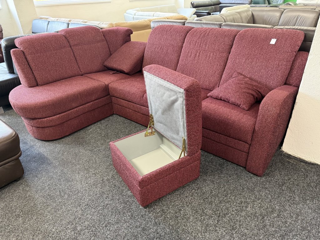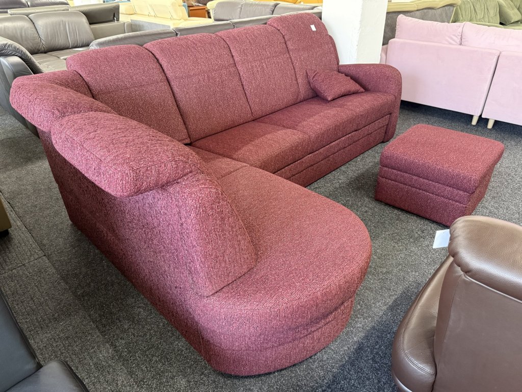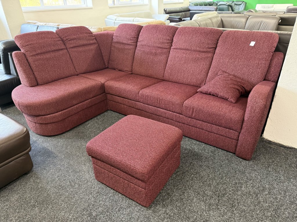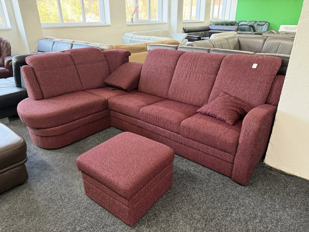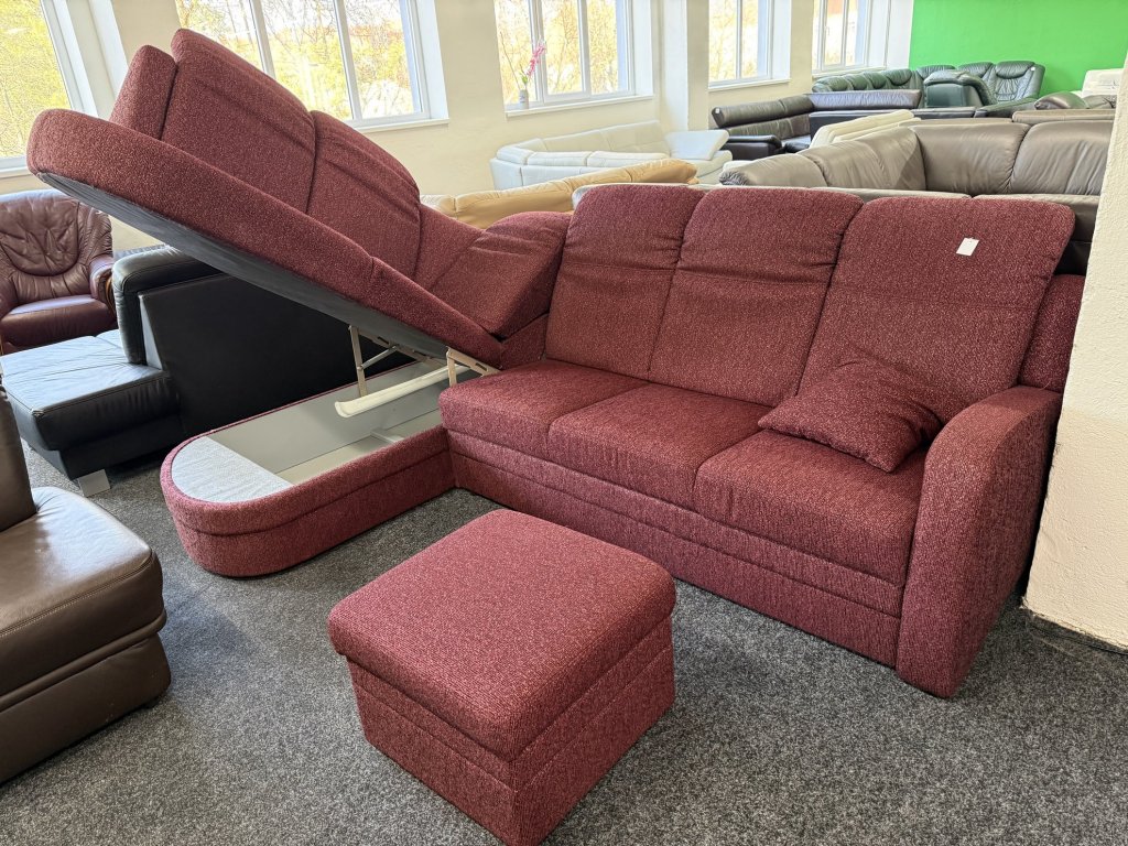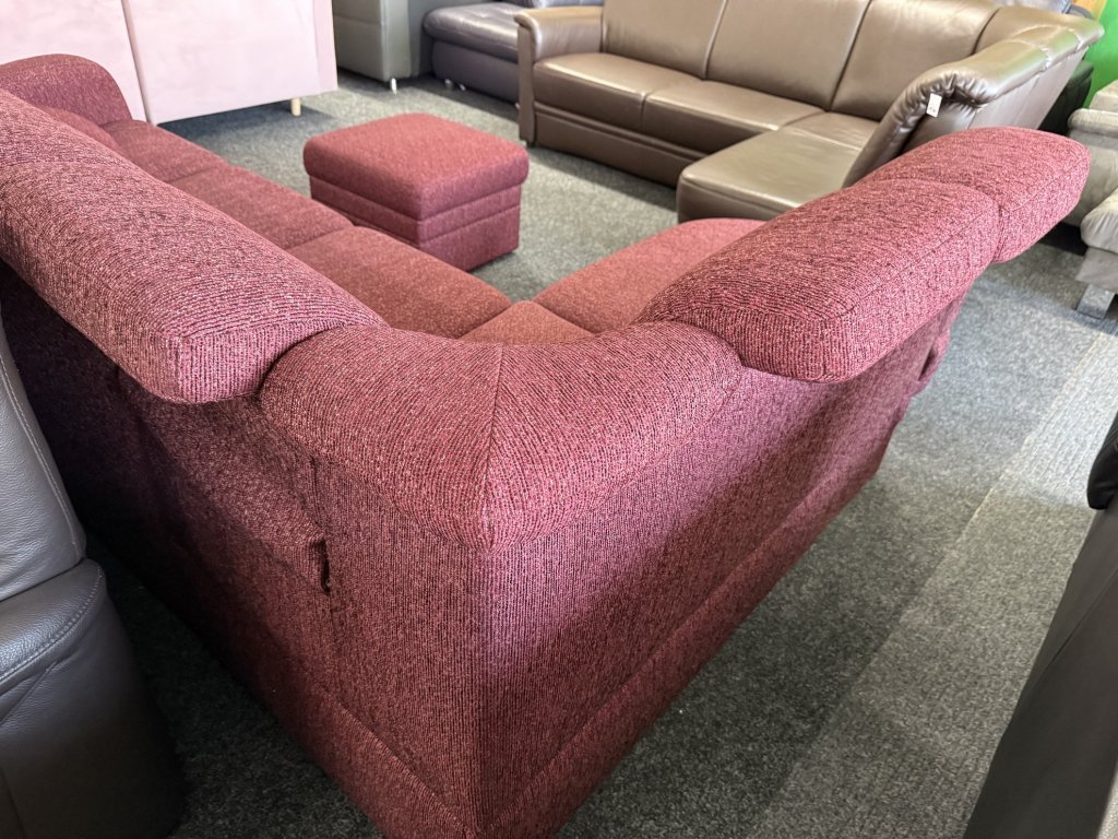 Rohová sedací souprava s látkovým potahem v červeném odstínu. Součástí sestavy je samostatný taburet s úložným prostorem. Sedací souprava má relaxační roh a polohovací opěrky hlavy. Provedení je celočalouněné. Sedací souprava je zánovní.