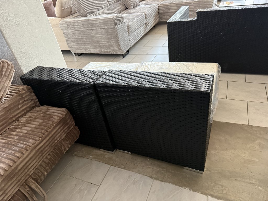 Křesla mají moderní hranatý tvar s výpletem z umělého ratanu v tmavém odstínu. Součástí jsou světlé sedáky, které kontrastují s konstrukcí.