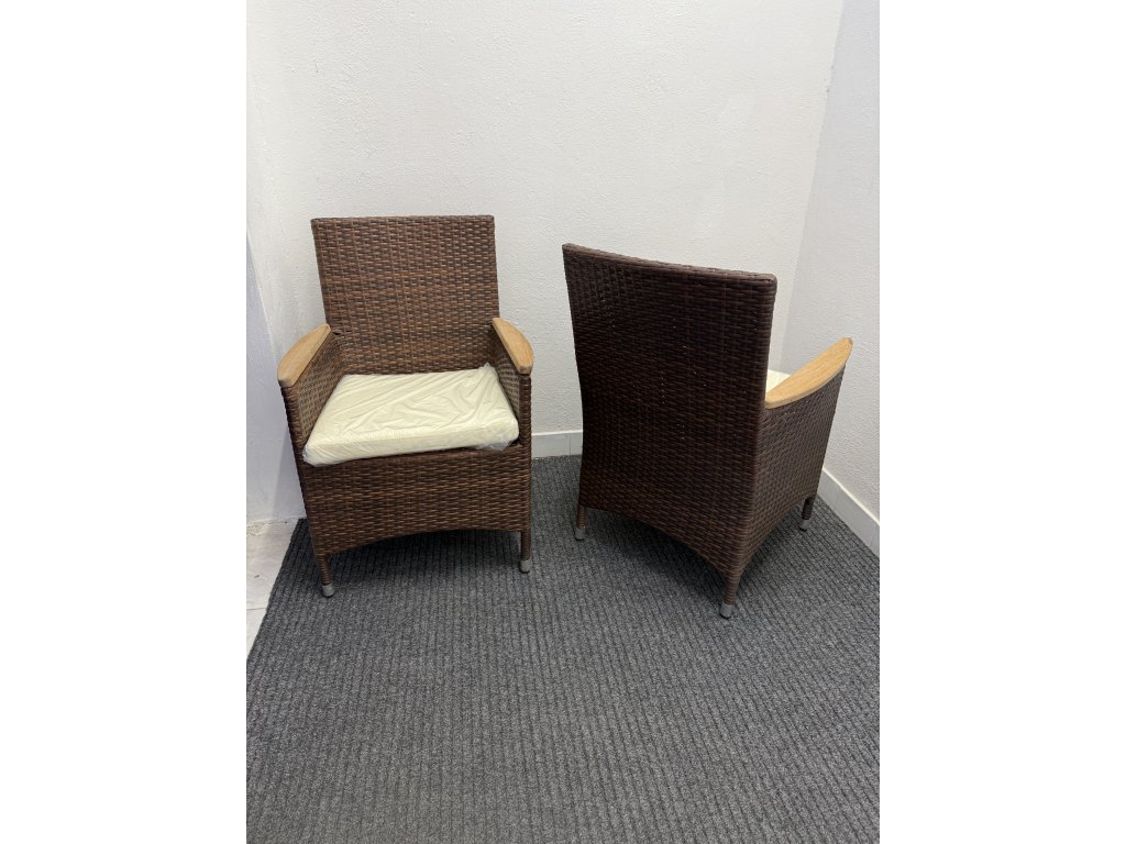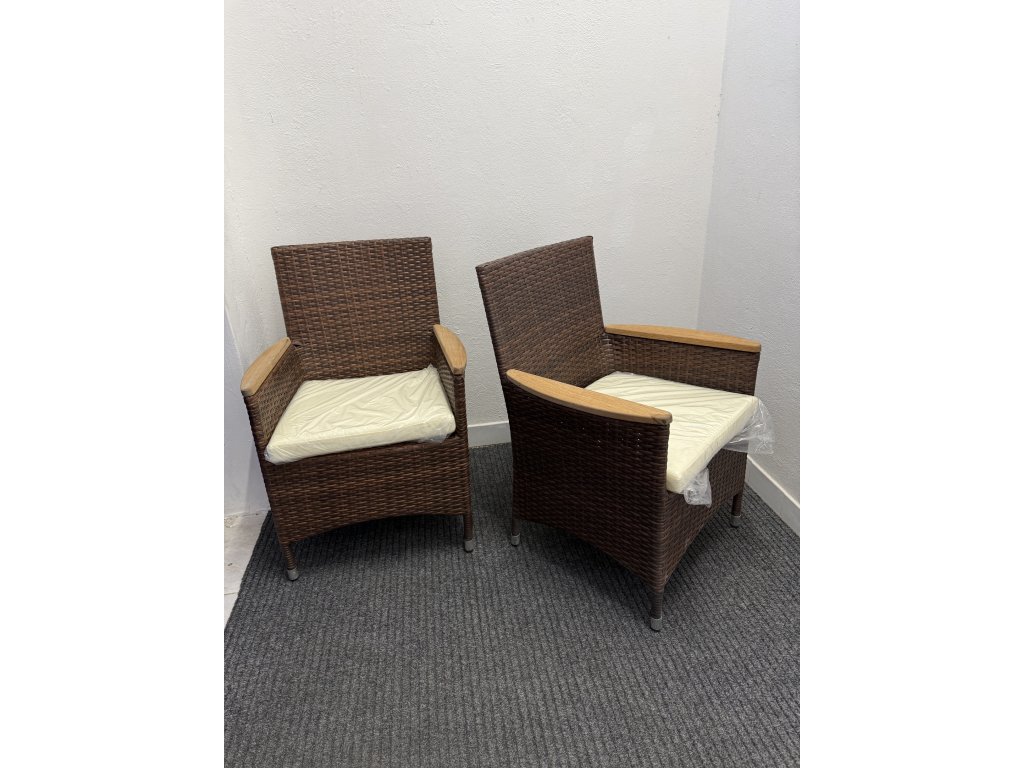 Křesla mají pevnou konstrukci s výpletem z umělého ratanu v hnědém odstínu. Područky jsou doplněny o dřevěné prvky. Součástí jsou světlé sedáky.