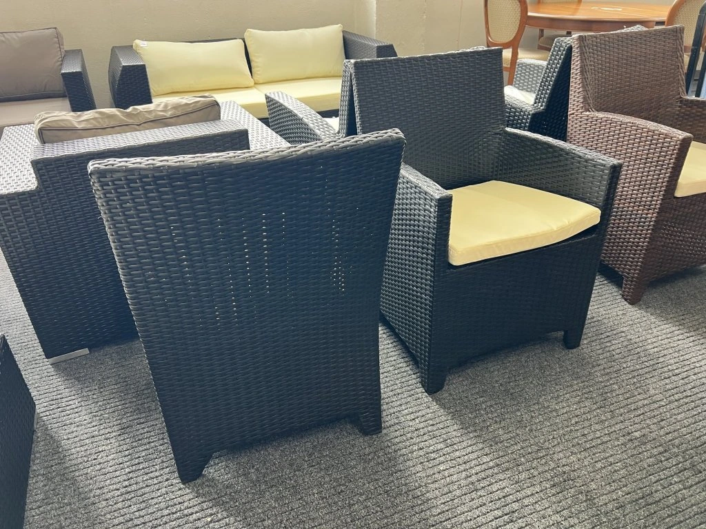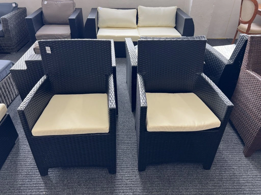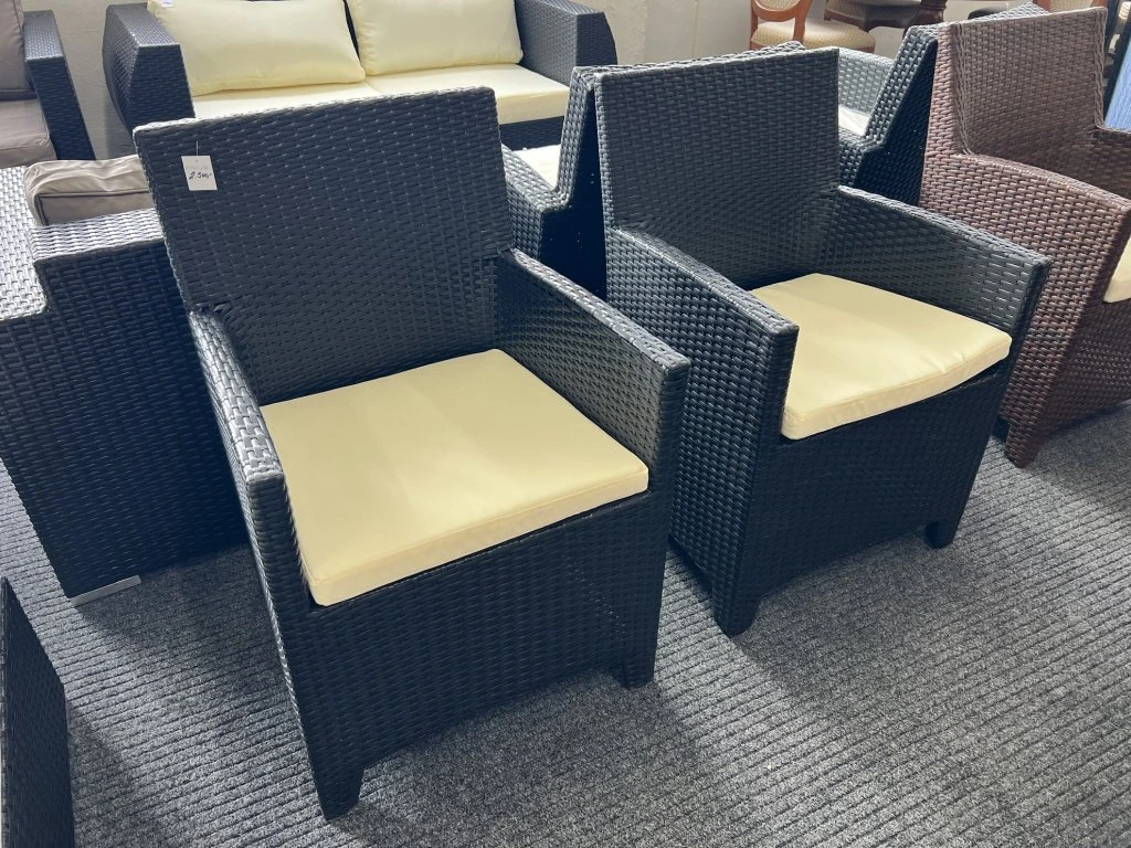 Sada dvou křesel vyrobených z umělého ratanu v tmavém provedení se sedacími polstry. Konstrukce je pevná, křesla mají područky a vyšší opěrnou část zad. Určeno pro vnitřní i venkovní využití. Křesla jsou nepoužitá.