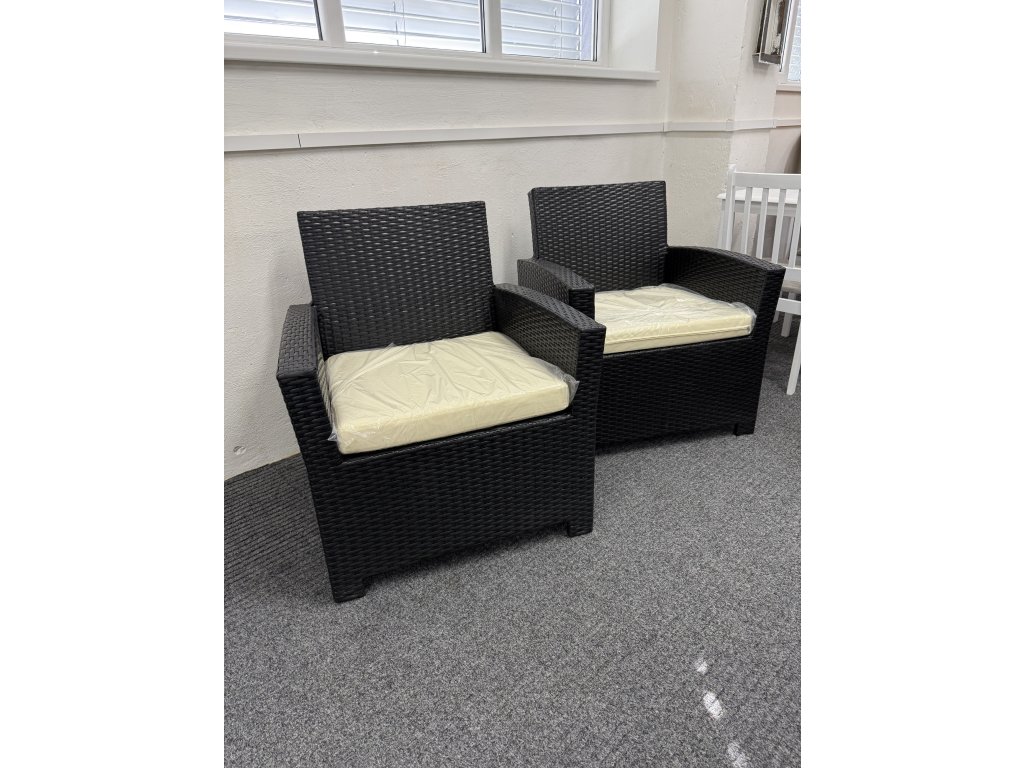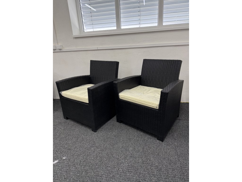 Sada dvou křesel z umělého ratanu vhodná pro venkovní i vnitřní využití. Konstrukce je doplněna o sedací polstry.