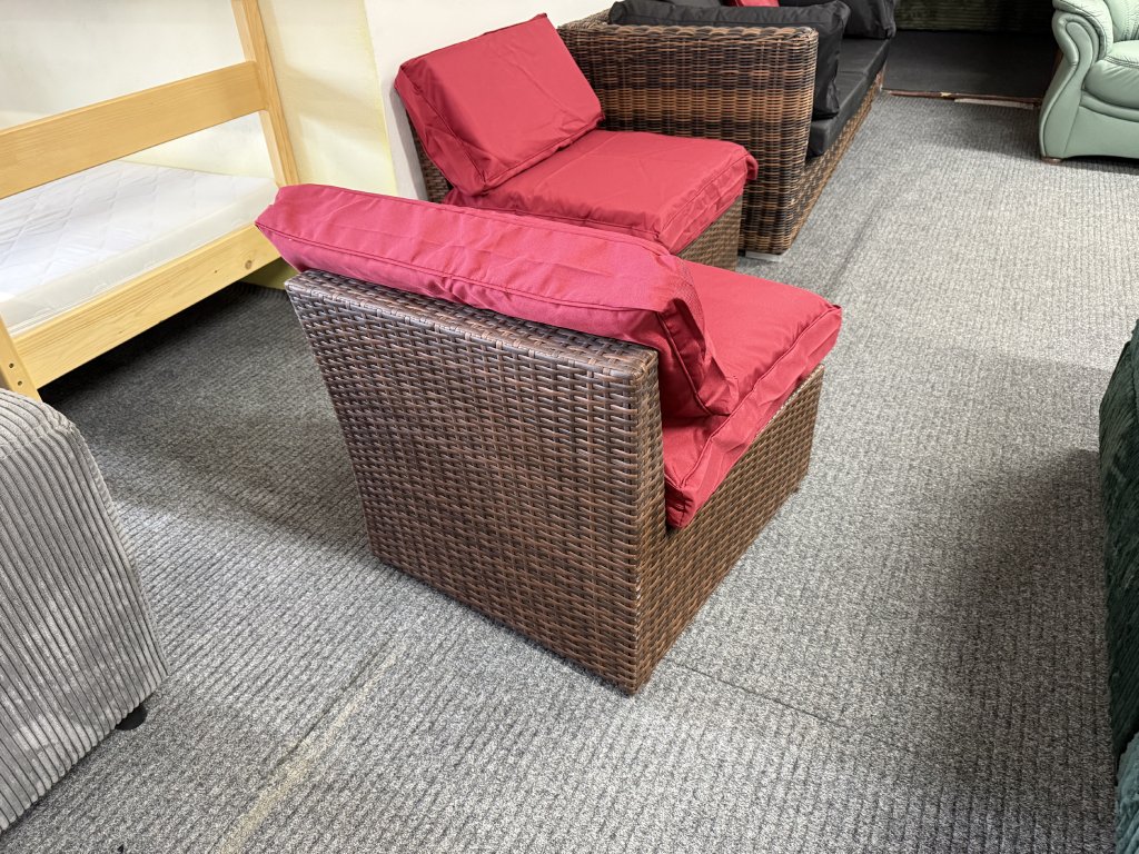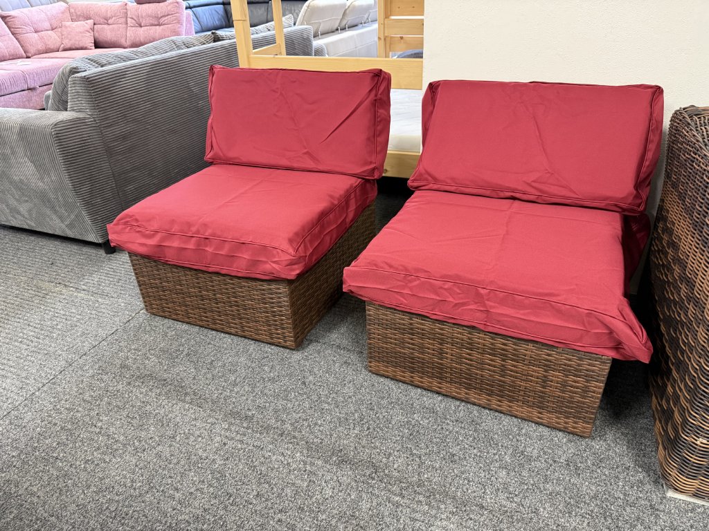 Křesla mají kompaktní tvar s rovnými liniemi a vyšší opěrkou zad. Výplet v hnědém odstínu je doplněn o červené polstry.