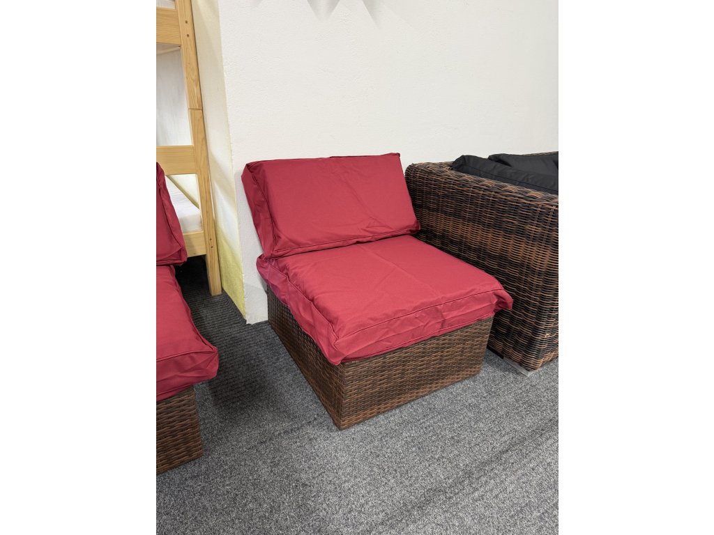 Použit umělý ratan, vhodný pro běžné venkovní i interiérové použití. Polstry jsou textilní, volně ložené.