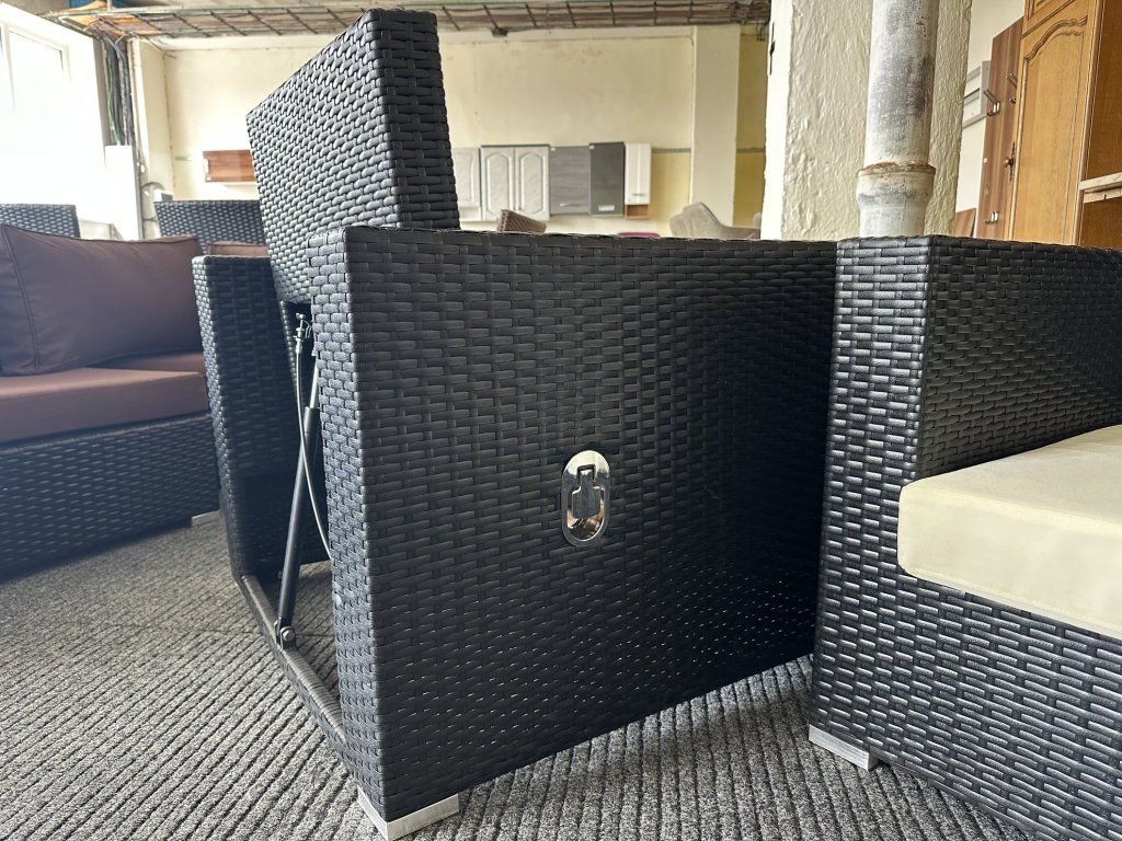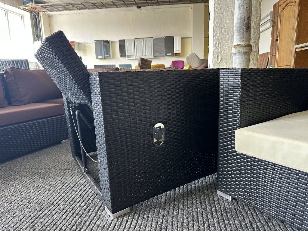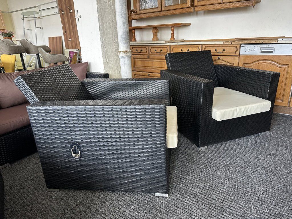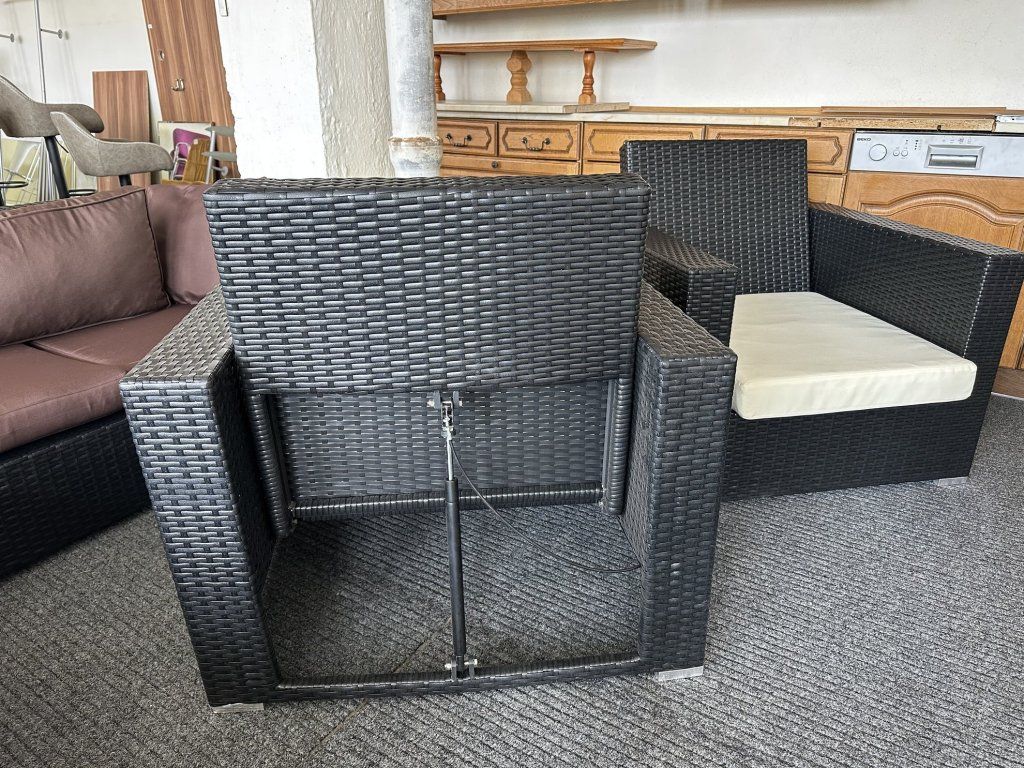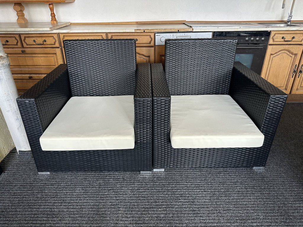 Sada dvou křesel vyrobených z umělého ratanu s polohovatelnou opěrkou zad. Konstrukce je tvořena pevným rámem s výpletem v tmavém odstínu. Součástí jsou sedací polštáře. Křesla jsou nepoužitá.